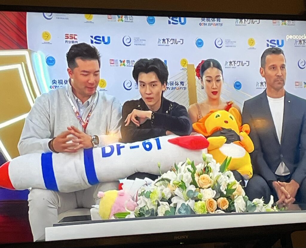 The incident occurred in the “kiss and cry” area, where skaters usually await their scores after performing. Television footage captured Ren and Xing sitting with a large toy resembling a missile labeled “DF-61.” The pair, along with their coach, briefly held the toy before placing it across Xing’s lap. The display raised eyebrows among spectators and viewers around the world due to the object’s resemblance to a real intercontinental ballistic missile.