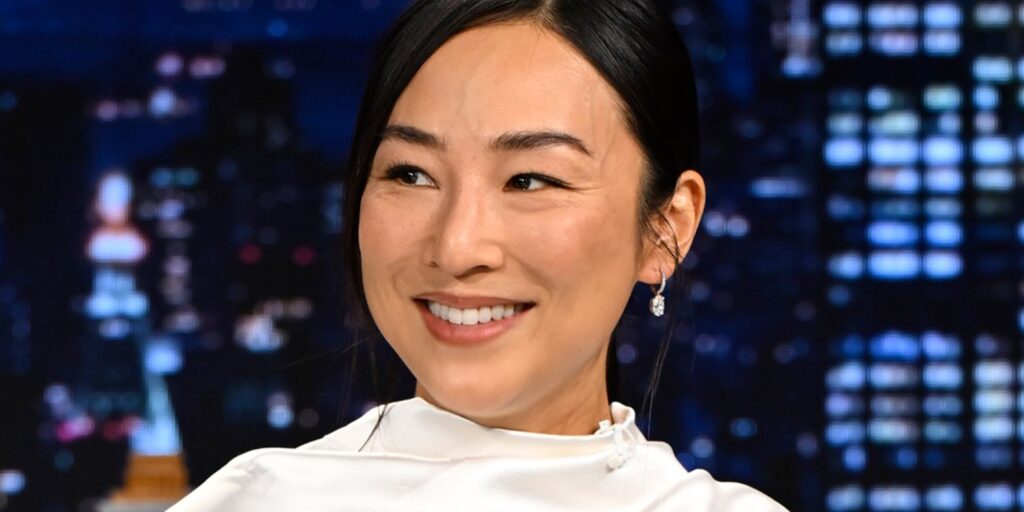 Actress Greta Lee turned heads this week with a look that perfectly blended vintage flair and modern sophistication. In a new InStyle spotlight, the Past Lives star was praised for her ’80s-inspired satin ensemble — a crisp white cowl-neck top paired with matching tailored pants, exuding minimalist yet glamorous retro energy.